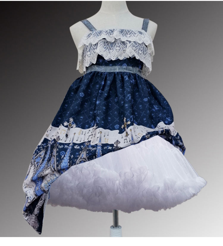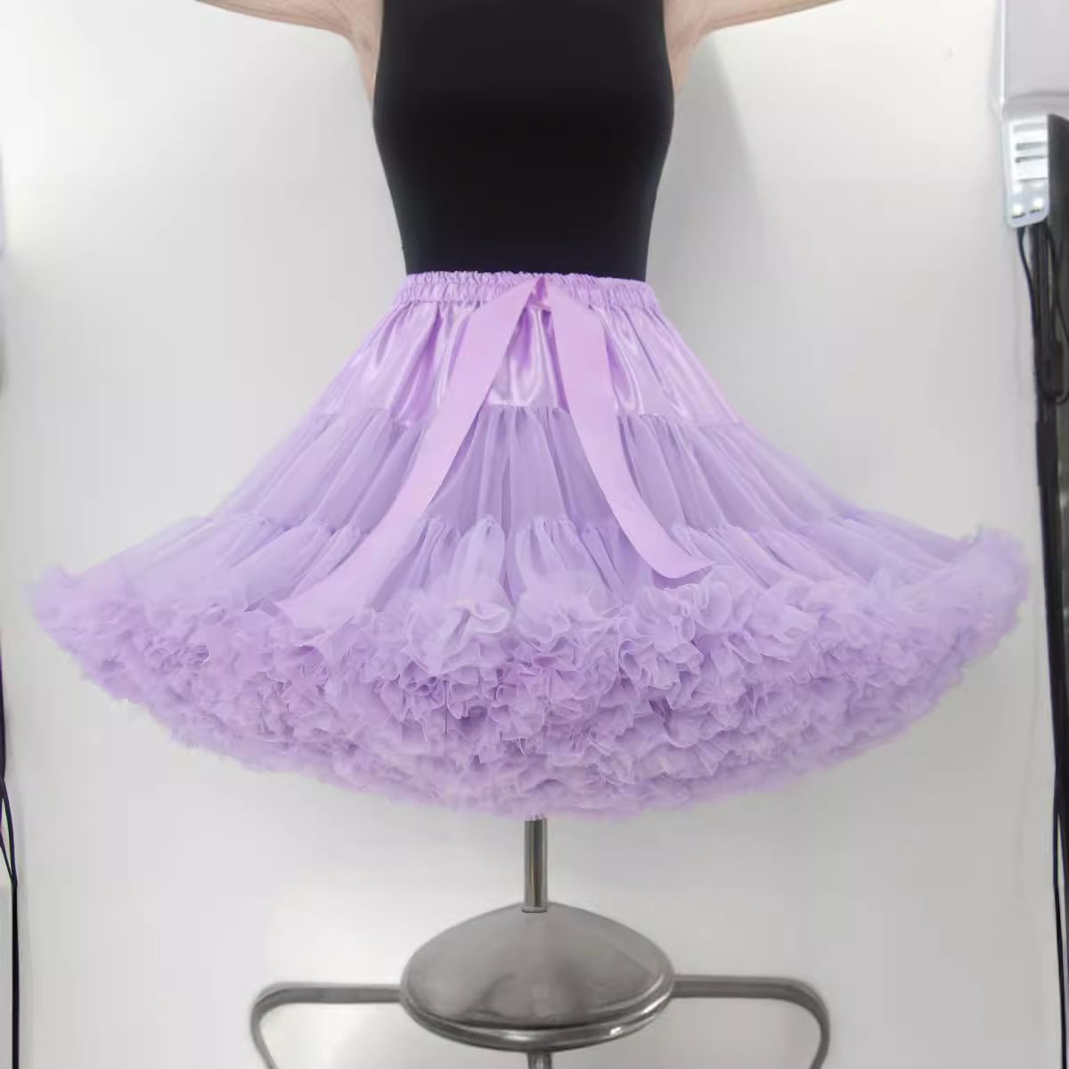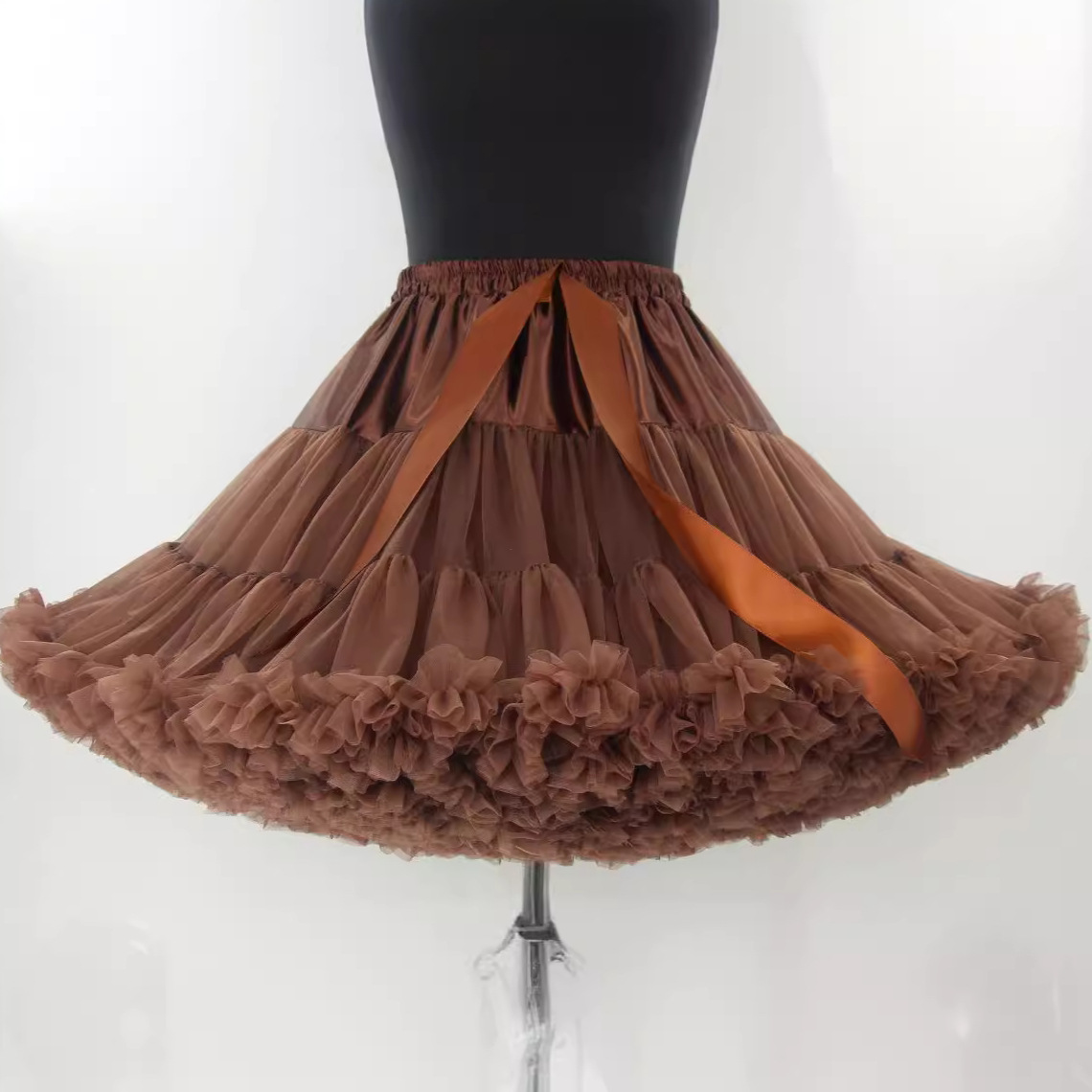裾に施されたフリルが華やかな広がりを演出し、ドレスやスカートのシルエットを美しく整えます。