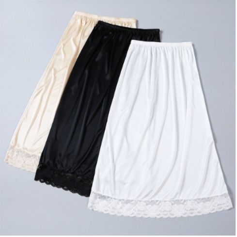 上品な光沢感のある生地が特徴のペチコートスカートです。 裾部分には繊細なレースをあしらい、透けるスカートの下に着用しても美しく決まります。 ウエストはゴム仕様で着脱しやすく、快適な履き心地を実現しました。 滑らかな肌触りの素材で一日中快適に過ごせます。 ワンピースやシアースカートのインナーとして重宝する万能アイテムです。